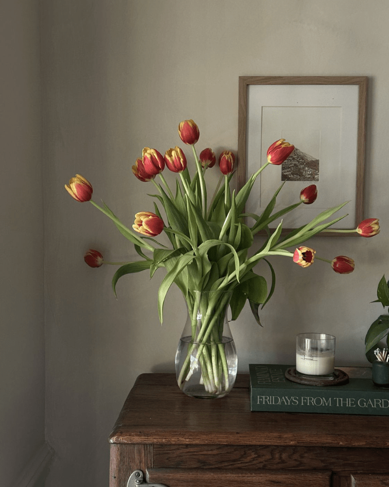 I like to start with fresh flowers, tulips always feel right. They bring movement, softness and a quiet sense of seasonality, and instantly make a room feel more alive without trying too hard.